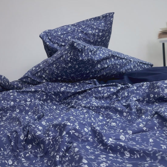 Wrap yourself in the delicate charm of Midnight Bloom — a rich navy bedding set sprinkled with soft floral details. A design that blends timeless elegance with cozy comfort, perfect for any refined bedroom style.