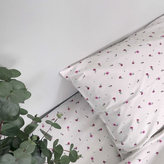 The Roseberry Dots bedding set brings a cheerful yet calming mood to your bedroom. Tiny rosebud motifs scattered across a crisp white background create a charming and romantic look. Perfect for both adults and teens who love gentle floral patterns.