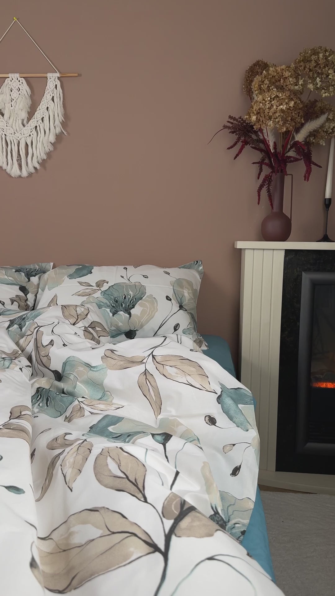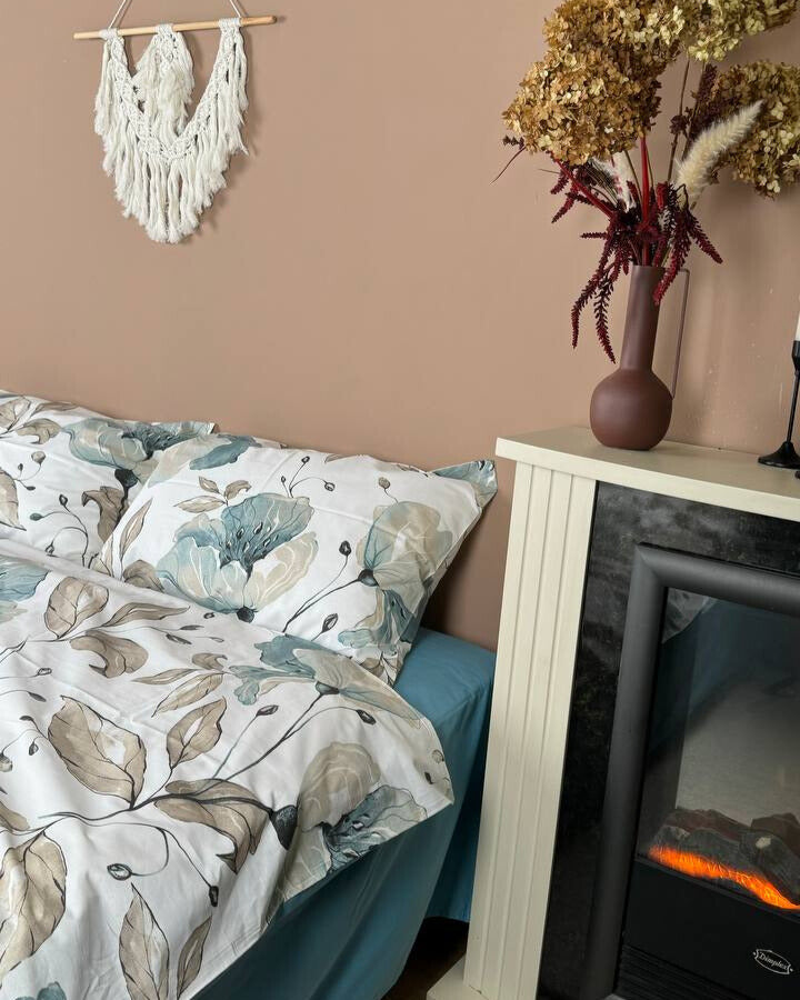 Delicate watercolor-style florals in soft teal, beige, and earthy tones create a calm and modern look, beautifully paired with a rich aqua-blue fitted sheet for a harmonious contrast.