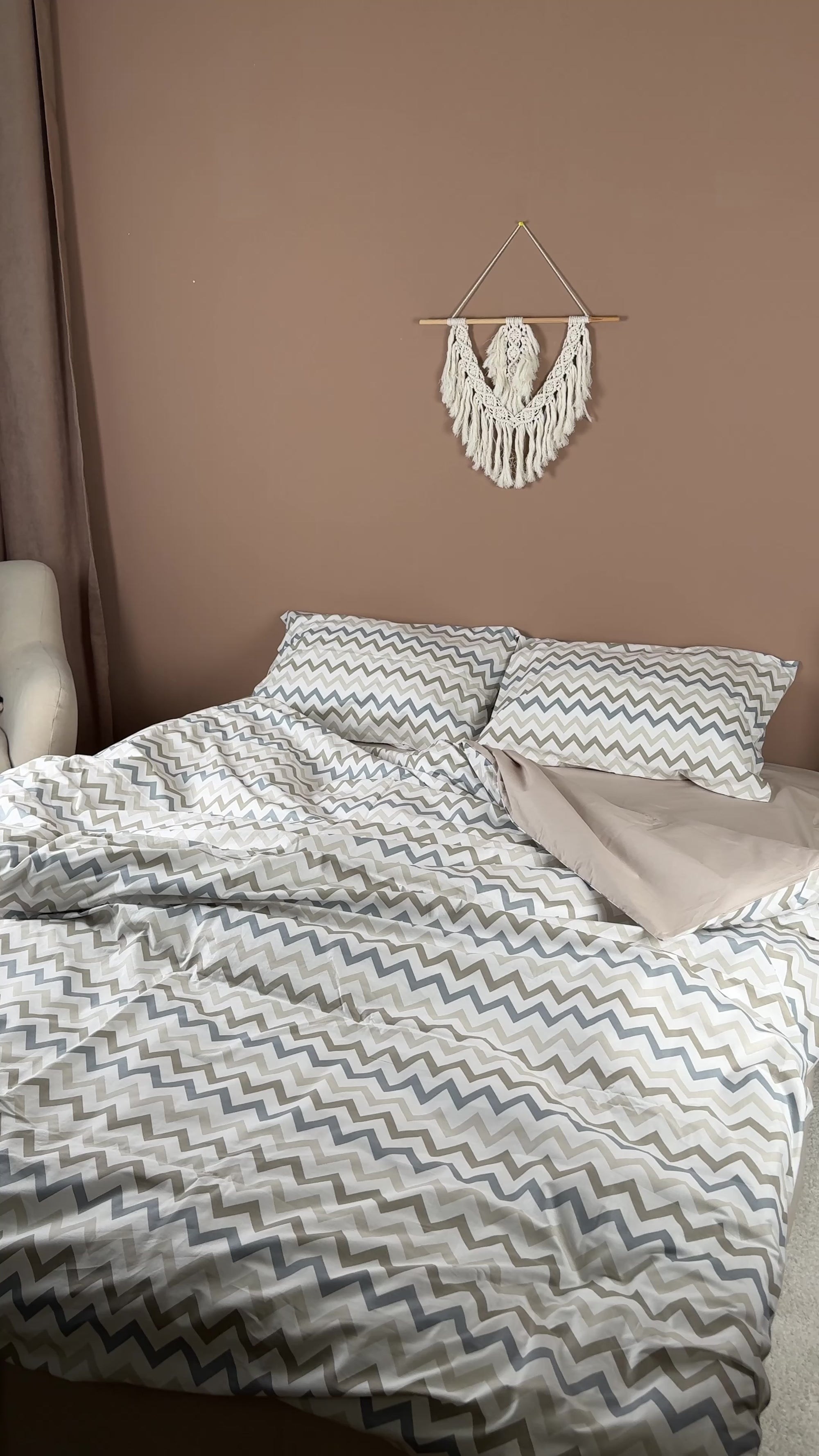 The zigzag pattern in beige, grey, and soft taupe brings a minimalist yet stylish look, while the solid sand-colored fitted sheet adds a cozy, natural touch.