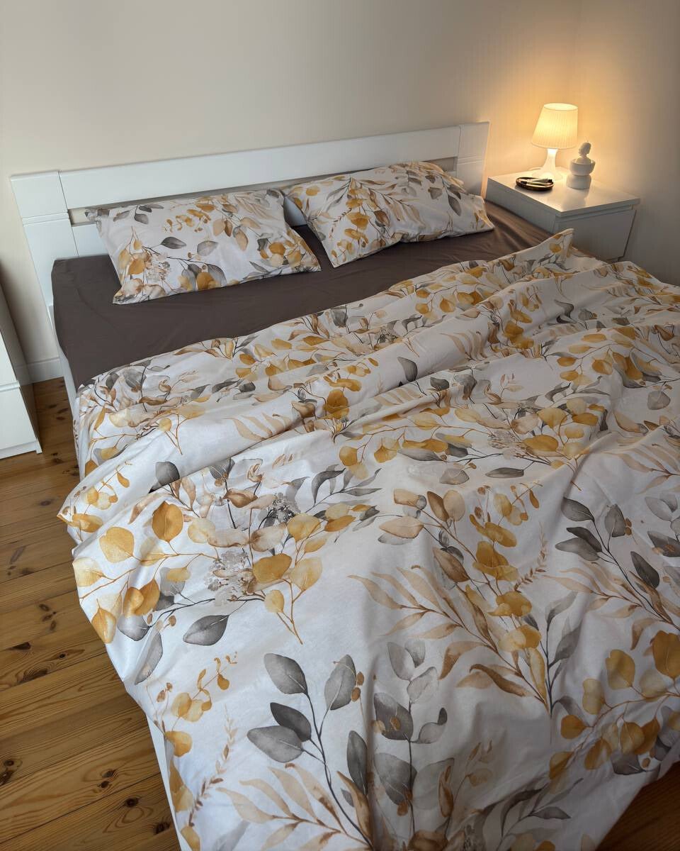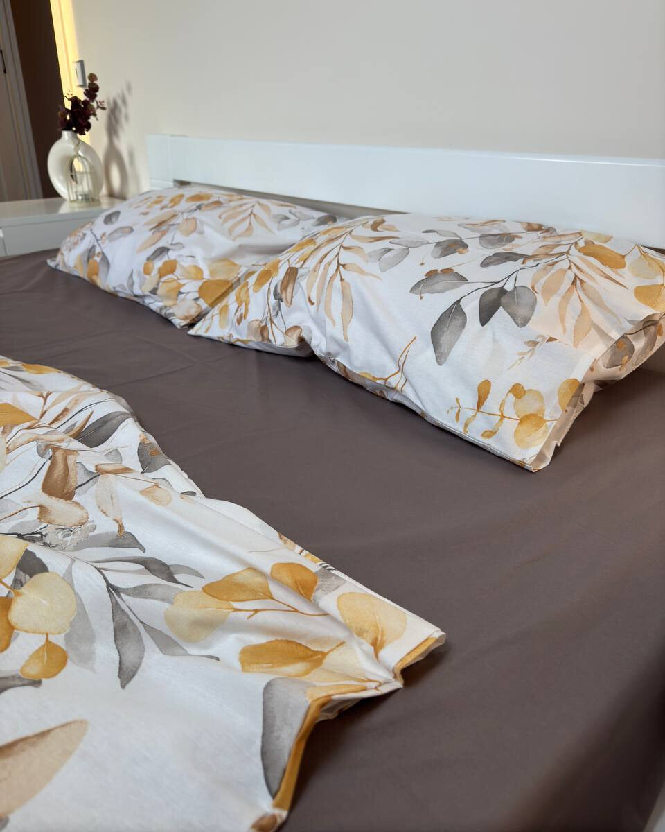A sophisticated ranforce bedding set featuring warm golden and grey eucalyptus leaves on a crisp white background. Made from 100% natural cotton, it offers breathability, softness, and a refined touch of autumnal elegance to your bedroom.