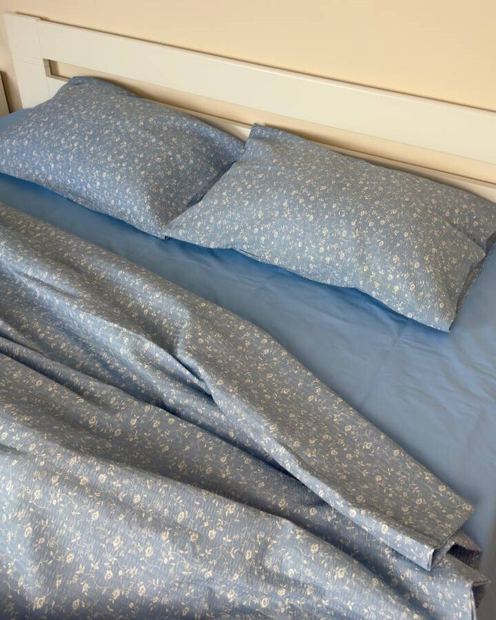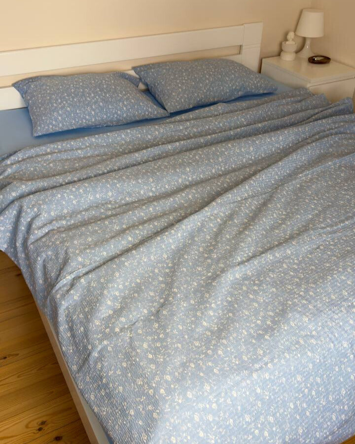 Drift into a peaceful night's sleep with our Blue Blossom bedding set, crafted from breathable seersucker ranforce cotton. Featuring a soft crinkled texture and a delicate white floral pattern on dusty blue, it’s the perfect blend of comfort and charm. Wrinkle-free and low-maintenance – no ironing needed. Ideal for adding a romantic touch to your bedroom.